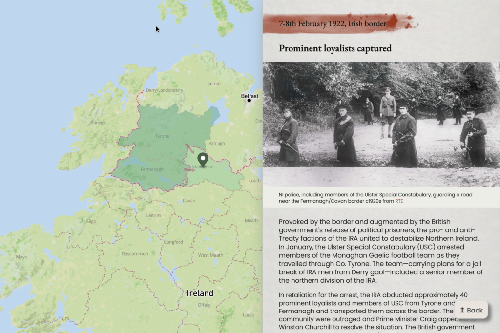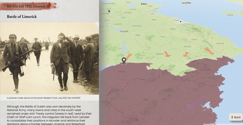 The Irish Civil War timeline combines interactive maps, narrative text, digitised artefacts, and curated secondary sources to create a location-based historical narrative. It foregrounds the role of landscape and place in shaping the conflict and enables learners to explore events progressively in both time and space.